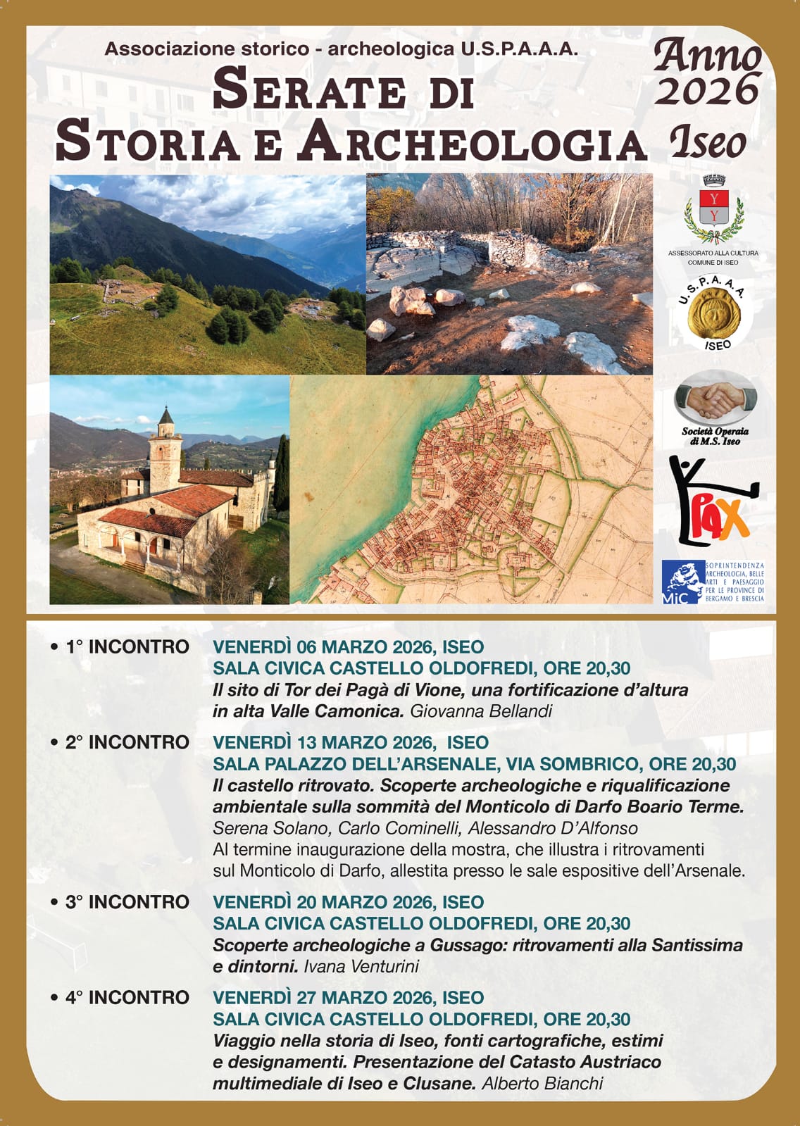La mostra Il castello ritrovato. Scoperte archeologiche e riqualificazione ambientale sulla sommità del Monticolo di Darfo Boario Terme verrà inaugurata presso il Palazzo Arsenale di Iseo venerdì 13 marzo alle ore 20.30. Presentano i curatori dott.ssa Serena Solano della Soprintendenza ABAP per le province di Bergamo e Brescia e Carlo Cominelli presidente della Cooperativa Sociale Onlus K-Pax.