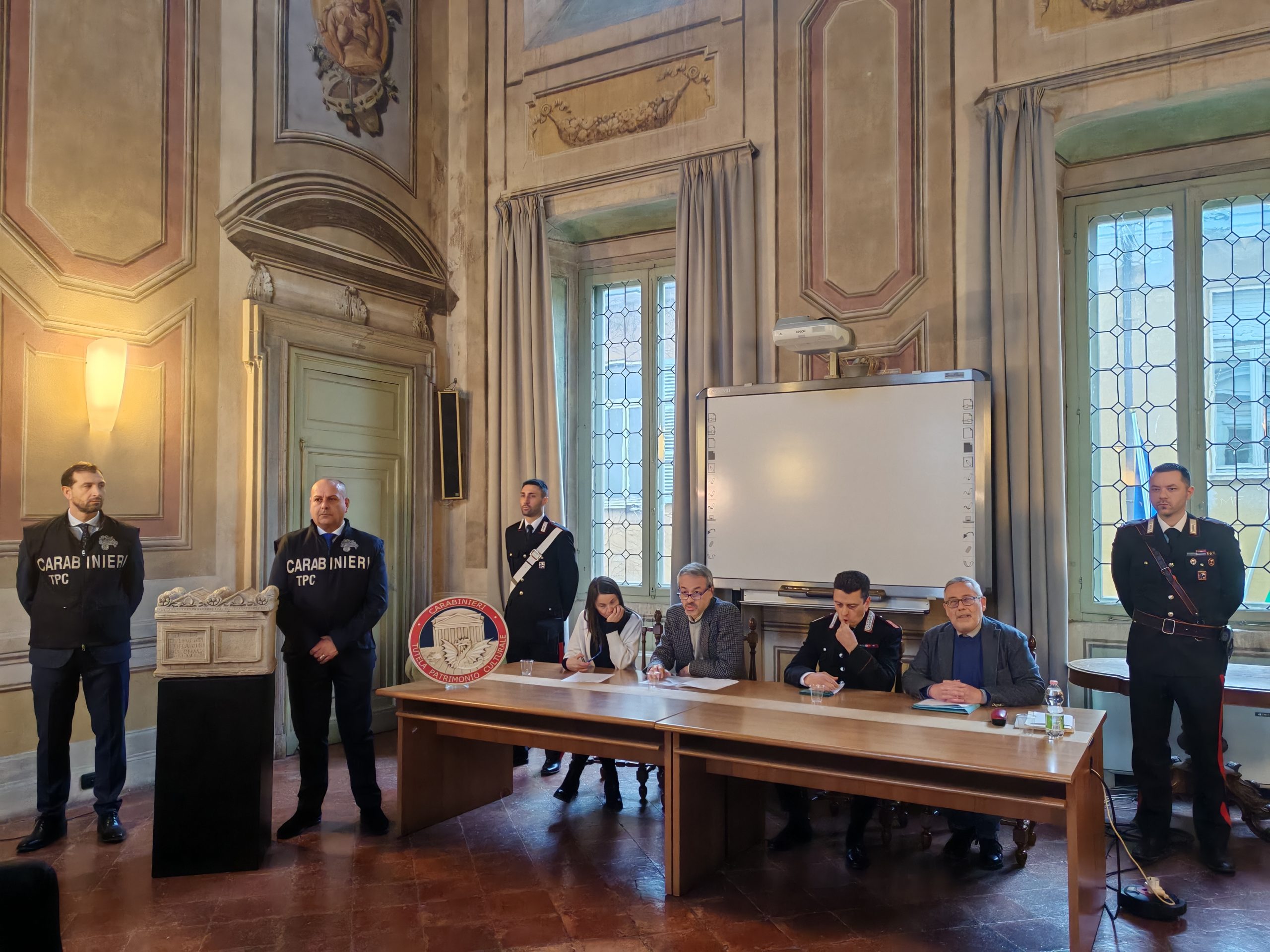 Si è tenuta oggi presso il Salone della Soprintendenza archeologia belle arti e paesaggio per le province di Bergamo e Brescia la conferenza stampa relativa ad un’importante operazione di polizia giudiziaria condotta dai Carabinieri del Nucleo Tutela dei Beni Culturali di Monza e dalla Soprintendenza che ha portato al recupero di alcuni reperti archeologici di grande interesse e valore a livello nazionale. Hanno presieduto la conferenza stampa il Soprintendente arch. Giuseppe Stolfi, il Luogotenente Carica Speciale Raffaele Adorante, la funzionario archeologo dott.ssa Serena Solano e il prof. Maurizio Paoletti dell’Università della Calabria.
